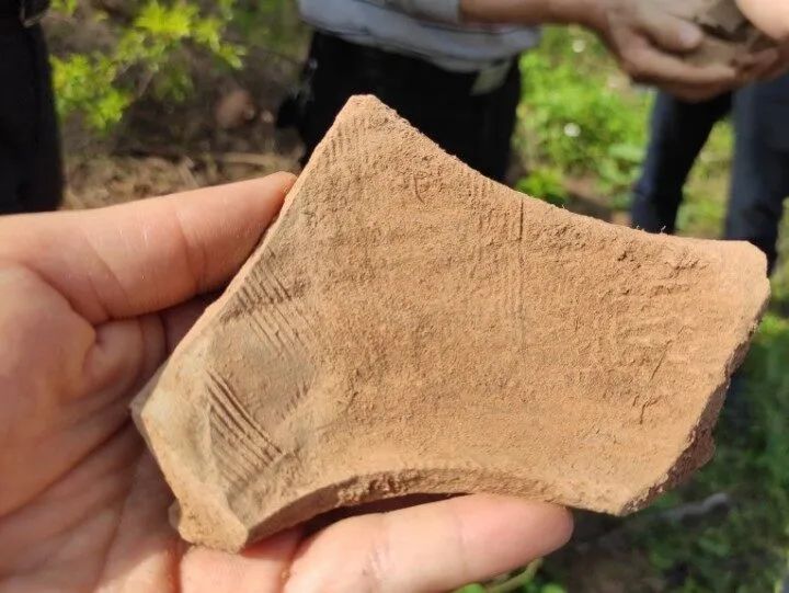 1983年12月第二次全國(guó)文物普查時(shí),普查人員在瓦窯嶺山頂?shù)牟莸厣习l(fā)現(xiàn)石刮削器、礪石、陶網(wǎng)墜和磨制的石網(wǎng)墜,同時(shí)還發(fā)現(xiàn)一批灰紅色的幾何形印紋硬陶片。紋飾有夔紋、小方格紋、藍(lán)紋,還有夔紋、菱形紋和弦紋的組合紋。方格紋有凸有凹。夔紋陶片數(shù)量最多,與粵東各縣出土的春秋時(shí)期陶罐上的夔紋相同。