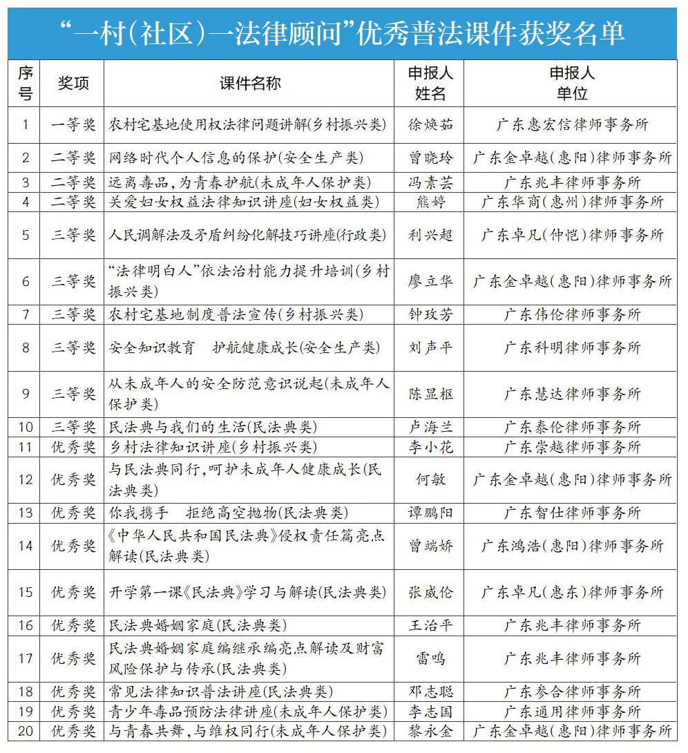 法治是最好的營商環(huán)境。去年,惠州律師充分發(fā)揮專業(yè)優(yōu)勢,持續(xù)助力法治惠州建設(shè),服務(wù)惠州高質(zhì)量發(fā)展。據(jù)悉,我市很多律師擔(dān)任黨政機(jī)關(guān)、事業(yè)單位、工業(yè)園區(qū)和企業(yè)的法律顧問,共有48名律師擔(dān)任“兩代表一委員”,為黨委政府依法執(zhí)政、依法履職提供了有效的法律服務(wù);我市律師抓住用好“雙區(qū)”和兩個(gè)合作區(qū)建設(shè)重大機(jī)遇,主動服務(wù)惠州建設(shè)的總體工作部署,服務(wù)重大項(xiàng)目建設(shè),為重大項(xiàng)目落地提供優(yōu)質(zhì)高效的法律服務(wù)。