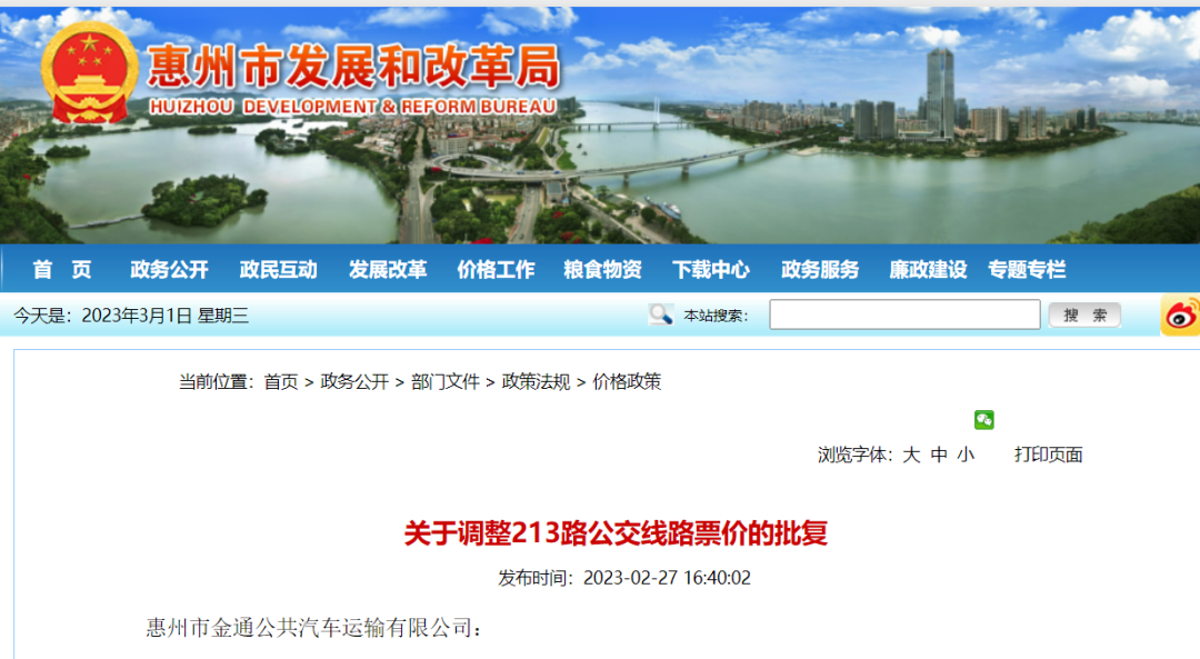 213路(惠州北站至潼湖科技小鎮(zhèn))公交線路票價(jià)從發(fā)文之日起執(zhí)行,原《關(guān)于核定201B公交線路票價(jià)的批復(fù)》(惠市發(fā)改價(jià)〔2019〕32號)文同時(shí)廢止。