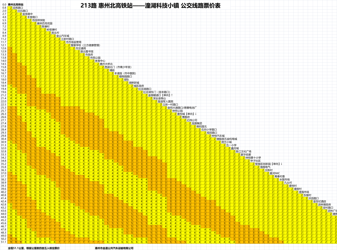 全程51.1公里,共設(shè)置75個(gè)停靠站點(diǎn),起步價(jià)2元/12公里,后每6公里增加1元,不足6公里也按增加1元執(zhí)行,全程票價(jià)9元/人次,各分段路程票價(jià)詳見附表。