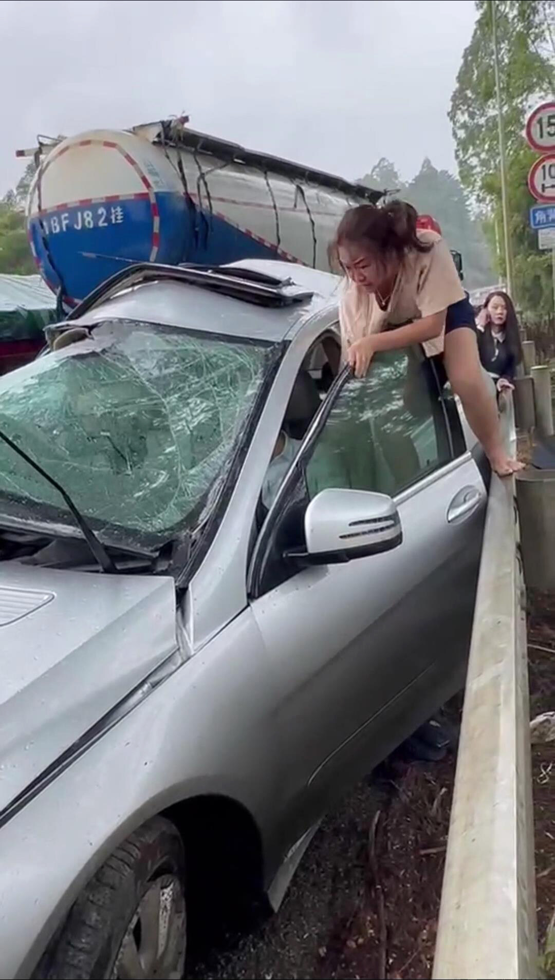 駕駛室車門緊挨著公路的護欄,僅能打開一個狹窄的空間,溫偉蓮不顧安危,踩著公路的護欄,拖鞋掉了一只也顧不上,她用身體撐開駕駛室車門施救。