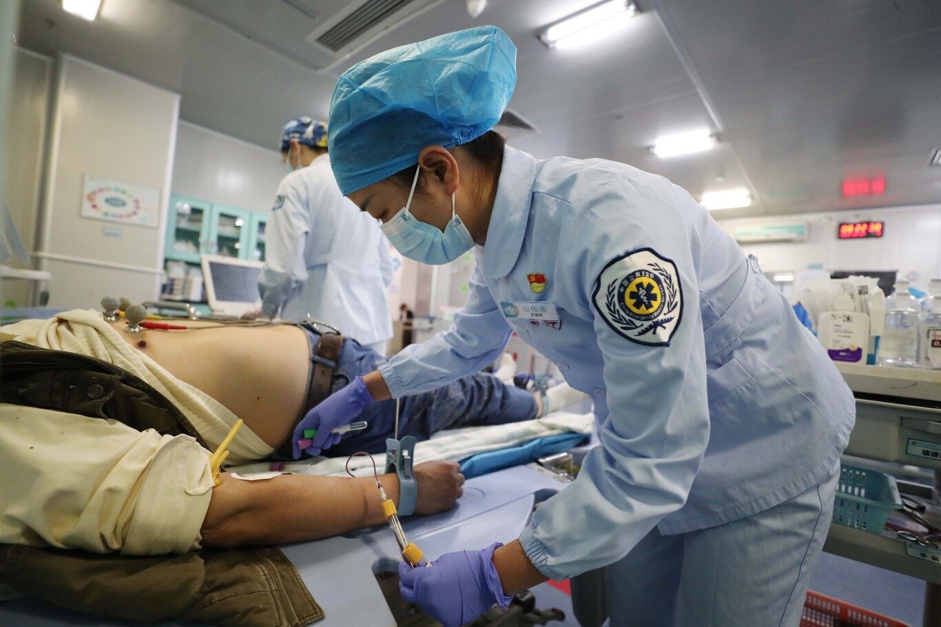 溫偉蓮接過救護車上的救治物品,再次探進去給傷者打留置針,進行雙通道靜脈輸液,并用頸托固定保護頸椎等,直到2名傷者都上了救護車她才離開。