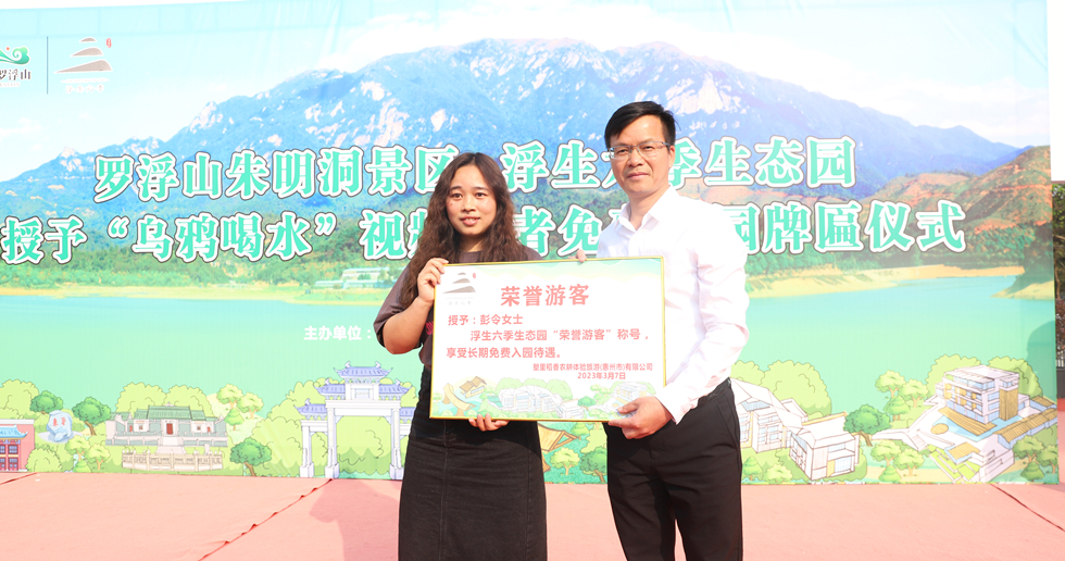 這是羅浮山風(fēng)景名勝區(qū)以及浮生六季生態(tài)園授予的首位“榮譽(yù)游客”。來自湖南湘西、現(xiàn)在惠陽上班的彭令,在授予儀式上分享了“烏鴉喝水”視頻拍攝經(jīng)過和發(fā)布的初衷,她表示,沒有想到一條拍給小孩看的有趣視頻會(huì)引起這么大的關(guān)注,能夠幫助宣傳推介羅浮山景點(diǎn),她感到非常開心!拔乙院笥锌盏脑,會(huì)經(jīng)常帶上家人和朋友來羅浮山游玩,同時(shí)也會(huì)繼續(xù)向更多的人推介羅浮山的旅游景點(diǎn)!迸砹钫f,很高興獲贈(zèng)羅浮山朱明洞景區(qū)、浮生六季生態(tài)園兩個(gè)景區(qū)的長期免費(fèi)入園門票。