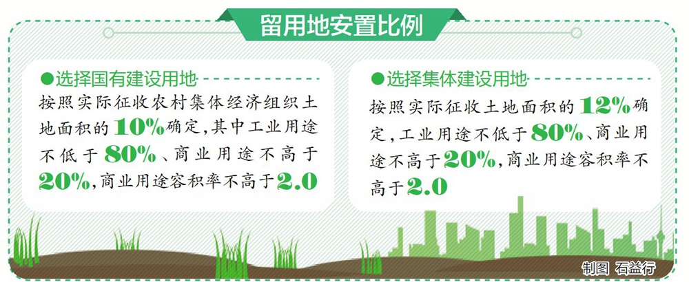 具體到安置比例上,選擇國有建設(shè)用地作為留用地安置的,按照實際征收農(nóng)村集體經(jīng)濟組織土地面積的10%確定,其中工業(yè)用途不低于80%、商業(yè)用途不高于20%,商業(yè)用途容積率不高于2.0;選擇集體建設(shè)用地的,按照實際征收土地面積的12%確定,工業(yè)用途不低于80%、商業(yè)用途不高于20%,商業(yè)用途容積率不高于2.0。