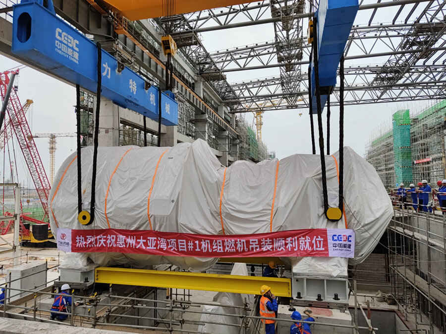 大亞灣石化區(qū)綜合能源項(xiàng)目1號(hào)機(jī)組燃?xì)廨啓C(jī)吊裝就位。