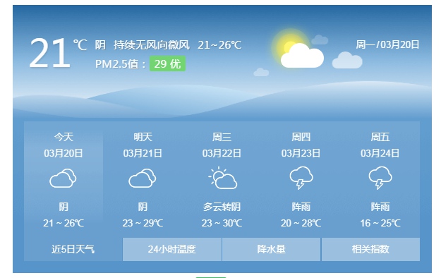 預(yù)計(jì)今天,我市陰天到多云,局部有零星小雨,早晚有輕霧,最低氣溫19°C左右,最高氣溫24~26°C;