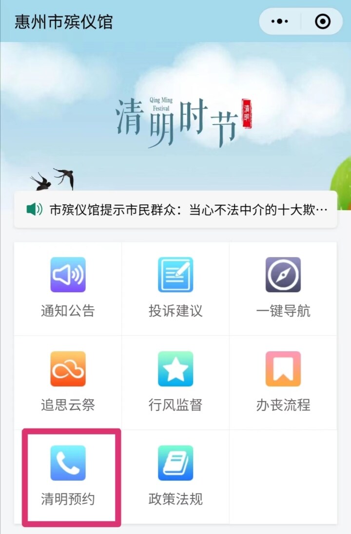 記者看到,目前“惠州市殯儀館”微信公眾號(hào)已開通“清明預(yù)約”欄目,并顯示該預(yù)約通道將于2023年3月23日開放。市民也可以通過“惠州民政”微信公眾號(hào),點(diǎn)擊“便民服務(wù)-祭掃預(yù)約”進(jìn)行預(yù)約。