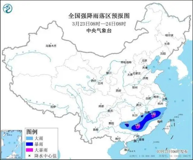 中央氣象臺3月23日06時發(fā)布暴雨藍色預警:
