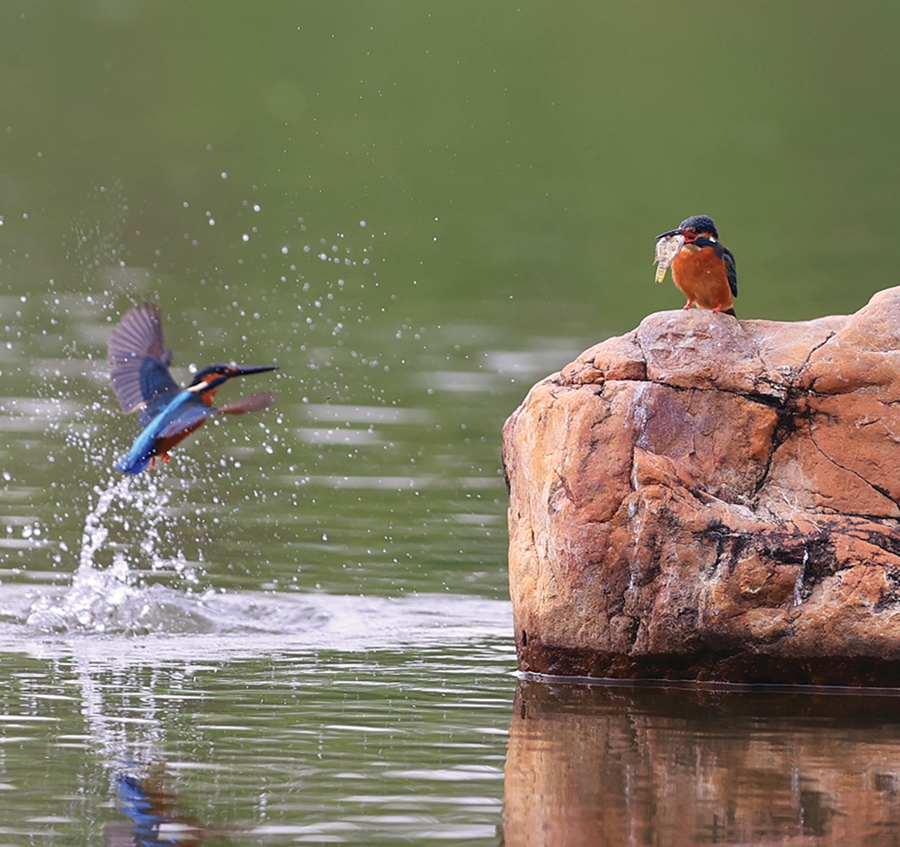 近期,每日清晨6點(diǎn)20分左右,翠鳥夫人便飛到惠州植物園湖中的一塊石頭上,先是扎進(jìn)水中,再飛回石頭上,精心梳洗打扮一番,便在上面鳴叫幾聲,等著翠鳥丈夫的到來。翠鳥丈夫則把準(zhǔn)備好的早餐叼到翠鳥夫人面前:有時(shí)是小魚,會把小魚的頭對著翠鳥夫人的嘴巴送過去,這樣吞咽的時(shí)候魚鰭就不會扎到喉嚨;有時(shí)是小蝦,他會把蝦尾對準(zhǔn)翠鳥夫人的嘴巴,這樣吞咽時(shí)就不會被蝦槍刺到喉嚨。午餐、晚餐,翠鳥丈夫都不辭辛勞地忙碌著,湖中充足的魚蝦滿足了翠鳥夫婦的饕餮之欲。丈夫無微不至的溫情和聰明贏得了翠鳥夫人的芳心,他們每天有2~3次的交配,蜜月期要持續(xù)一個(gè)星期左右。之后,便開始孵化幼鳥。
