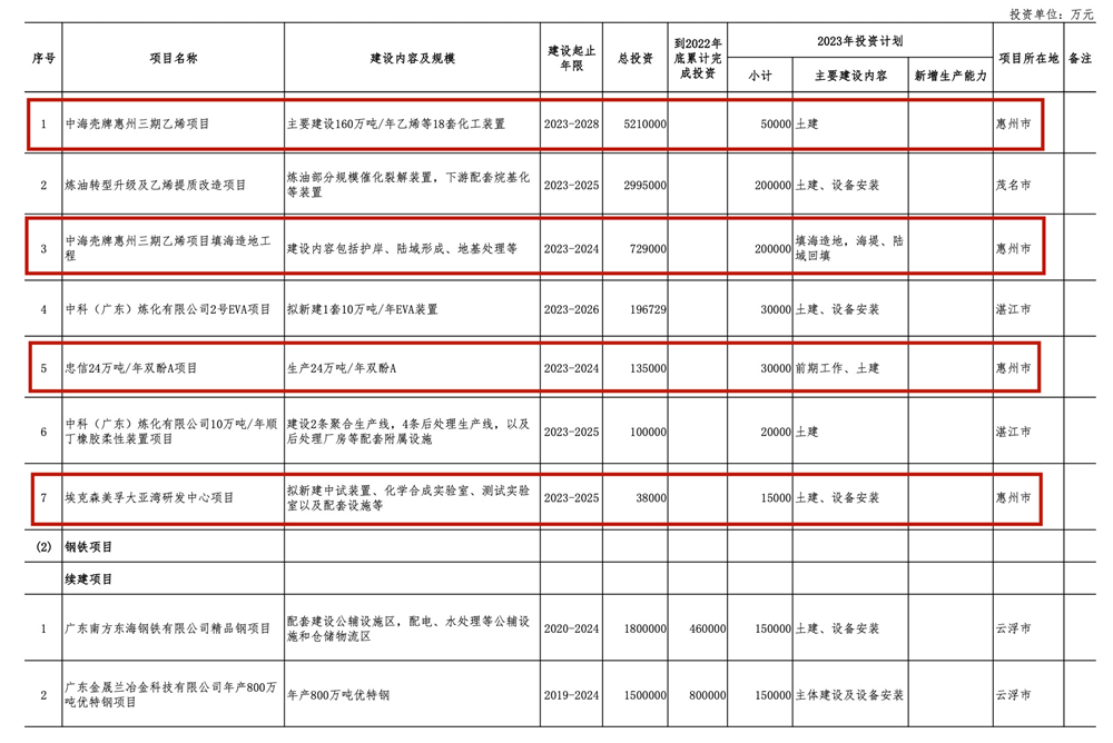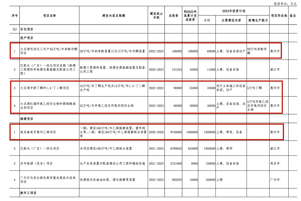 在續(xù)建項(xiàng)目方面,全省共有4個(gè),分別是?松梨诨葜菀蚁╉(xiàng)目、巴斯夫(廣東)一體化項(xiàng)目、東華能源(茂名)項(xiàng)目、廣州石化安全綠色高質(zhì)量發(fā)展技術(shù)改造項(xiàng)目。其中,埃克森美孚惠州乙烯項(xiàng)目位于惠州大亞灣石化區(qū)。