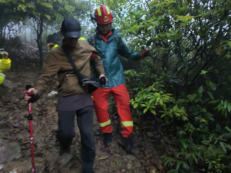 當天8時50分許,新圩鎮(zhèn)專職消防隊再次接獲求救電話,稱該男子無法找到下山路線,身體出現(xiàn)低溫、虛弱等狀態(tài),隨時有生命危險,需要消防救助。新圩鎮(zhèn)專職消防隊約場執(zhí)勤點再次安排消防員前往白云嶂盤古廟,與熟悉山頂環(huán)境的東莞清溪山地救援會匯合。