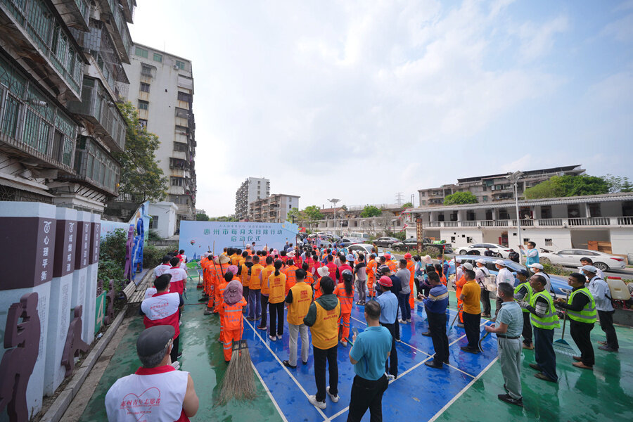 在3月17日舉辦的惠州市每月大掃除行動啟動儀式上,來自各級單位和部門的志愿者近百人齊聚惠城區(qū)江南街道辦事處園嶺社區(qū)石油宿舍小區(qū)廣場,共同見證并參與此次行動。在烈日下,他們有的拿起掃把清掃地面的落葉和垃圾,有的用手撿起綠化帶里的枯枝敗葉,有的拿起鏟子清理墻上的牛皮癬,有序分工,高效配合,讓“志愿紅”成為現(xiàn)場一抹靚色,F(xiàn)場還有工作人員負責垃圾清運、環(huán)境消殺等工作。