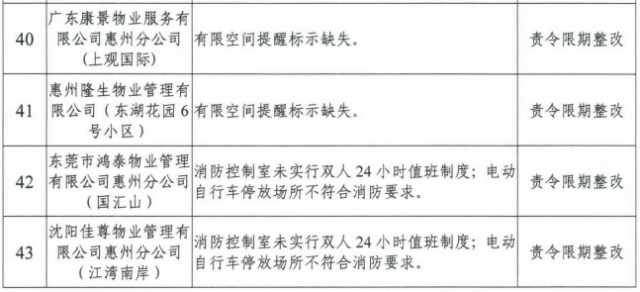 根據(jù)《公告》內(nèi)容,11家違法違規(guī)的物業(yè)企業(yè)中,目前僅有惠州市華基物業(yè)管理有限公司完成了違規(guī)行為的整改,廣東龍光集團(tuán)物業(yè)管理有限公司、惠州隆生物業(yè)管理有限公司等10家企業(yè)均被責(zé)令限期整改,尚處于整改過(guò)程中。