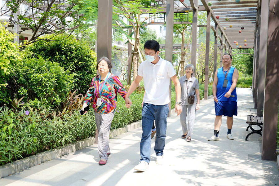 惠陽(yáng)區(qū)長(zhǎng)者安養(yǎng)中心工作人員陪老人散步。
