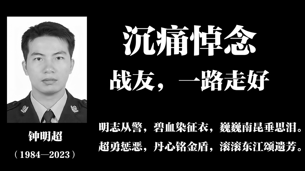 鐘明超,男,1984年12月出生,中共黨員,大學(xué)文化,2010年參加公安工作,三級警督警銜。生前系惠州市龍門縣公安局治安管理大隊一中隊中隊長、三級警長。從警以來,鐘明超同志長期奮戰(zhàn)在公安基層一線,先后榮立個人三等功4次,個人嘉獎1次,獲評“龍門縣公安局先進(jìn)個人”。2023年4月9日凌晨,鐘明超同志在執(zhí)行抓捕任務(wù)時遭受犯罪嫌疑人駕車拖行,不幸因公犧牲,年僅38歲。