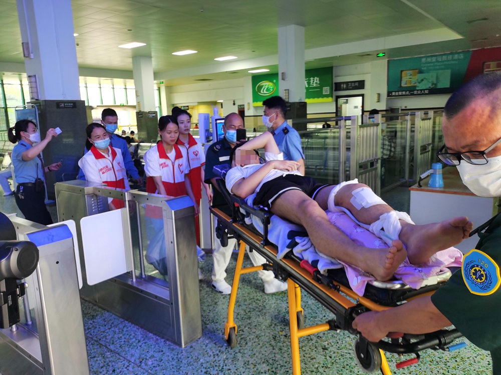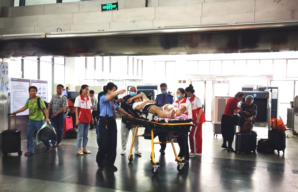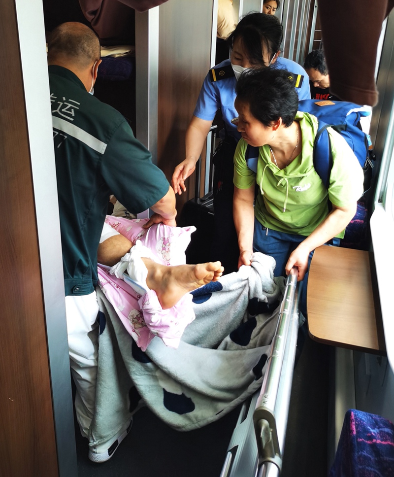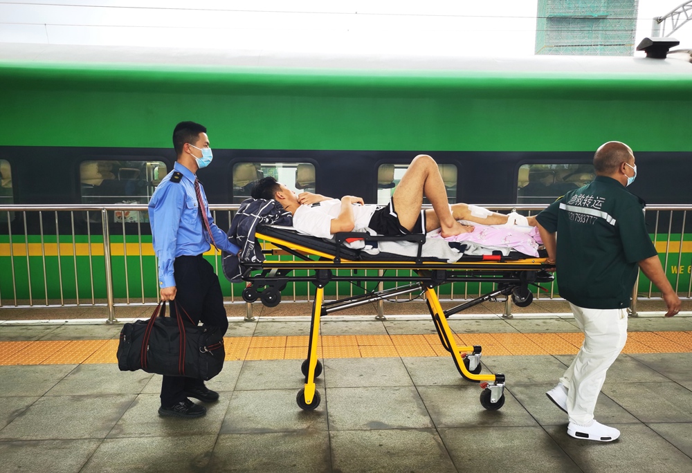 隨后,王奇磊迅速做好安排,并為該旅客臨時(shí)協(xié)調(diào)了一張下鋪。120救護(hù)車(chē)到達(dá)惠州火車(chē)站廣場(chǎng)后,王奇磊立刻協(xié)助醫(yī)護(hù)人員和家屬將旅客推下救護(hù)車(chē),并安排客運(yùn)員吳威成幫助旅客提拿行李。從進(jìn)站、安檢到站臺(tái),惠州火車(chē)站一路開(kāi)行“綠色通道”,保障該旅客順利上車(chē),全程用了不到20分鐘,旅客及其家屬連連道謝。