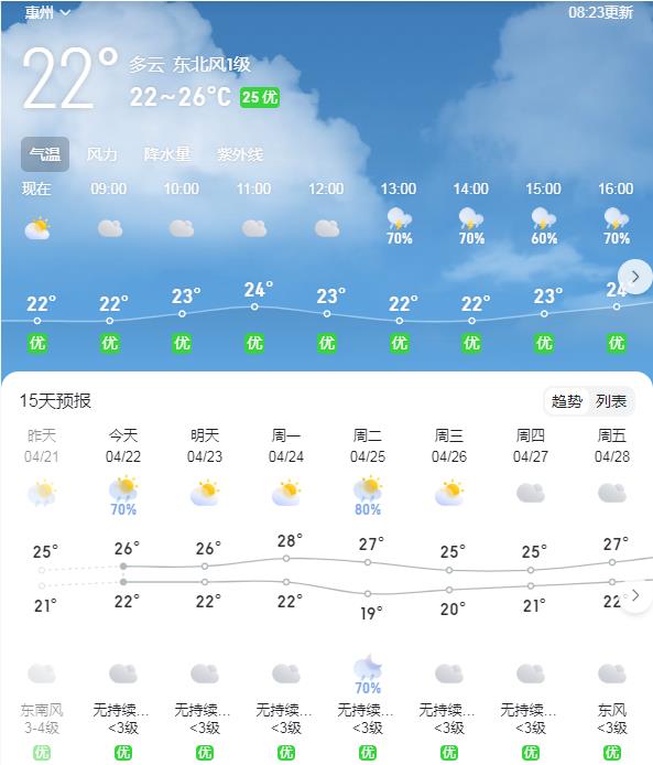 市氣象臺(tái)4月21日發(fā)布的惠州一周天氣趨勢(shì)顯示,預(yù)計(jì)4月22~24日,我市陰天間多云,有(雷)陣雨,氣溫22~28℃;25日,陰天,有雷陣雨局部大到暴雨,并伴有短時(shí)強(qiáng)降水、雷電和6~8級(jí)短時(shí)大風(fēng)等強(qiáng)對(duì)流天氣,氣溫22~26℃;26日,陣雨轉(zhuǎn)多云;27日,多云間陰天,局部有雷陣雨;28日,陰天到多云,有雷陣雨。氣象臺(tái)提醒市民,注意防御局地雷暴和短時(shí)大風(fēng)引發(fā)的廠房工棚、臨時(shí)構(gòu)筑物、戶外廣告牌和樹(shù)木倒塌等災(zāi)害。