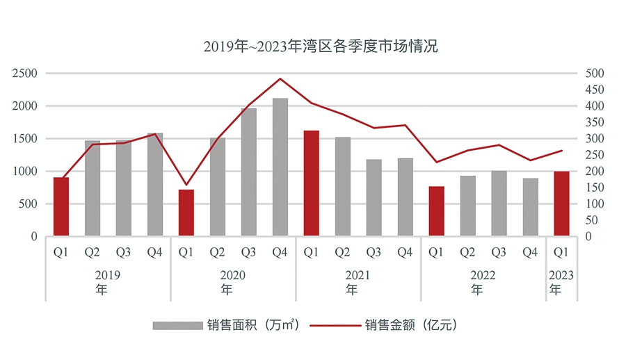 日前,世聯(lián)行發(fā)布的《2023年一季度大灣區(qū)樓市解讀及預(yù)判》報告顯示,今年一季度大灣區(qū)七城新房住宅成交面積同比上升30.09%,銷售金額同比上升15.42%。疫情影響消退、政策利好疊加刺激市場信心修復(fù),一季度大灣區(qū)房地產(chǎn)市場整體止跌回升,房企銷售面積、金額同比齊增。