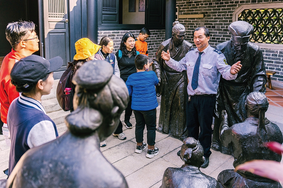 在蘇東坡故居前,工作人員為市民們介紹蘇東坡的故事。