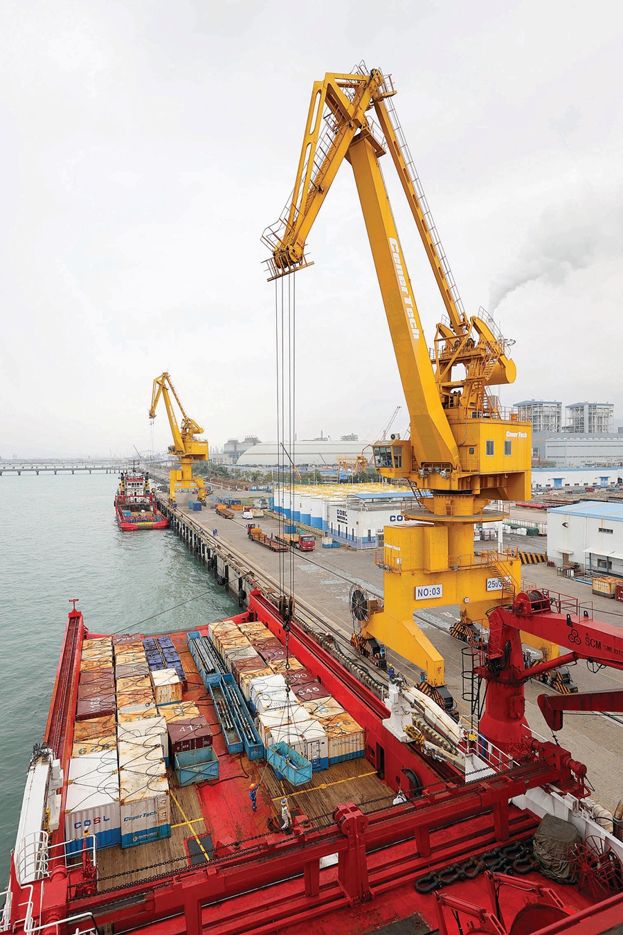 惠州大亞灣中海油惠州物流基地碼頭,吊車(chē)正將一箱箱即將送抵惠州油田海上鉆井平臺(tái)的物資裝載到“海洋石油681”船艙。