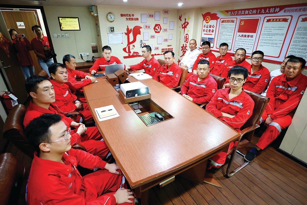 啟航前,“海洋石油681”船長(zhǎng)召集所有船員在會(huì)議室進(jìn)行出海安全教育。