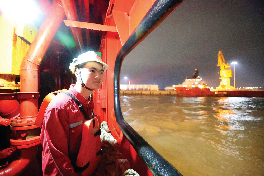 夜間行船過(guò)程中,“海洋石油681”年輕的船員在查看航道安全情況。