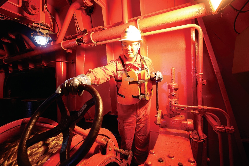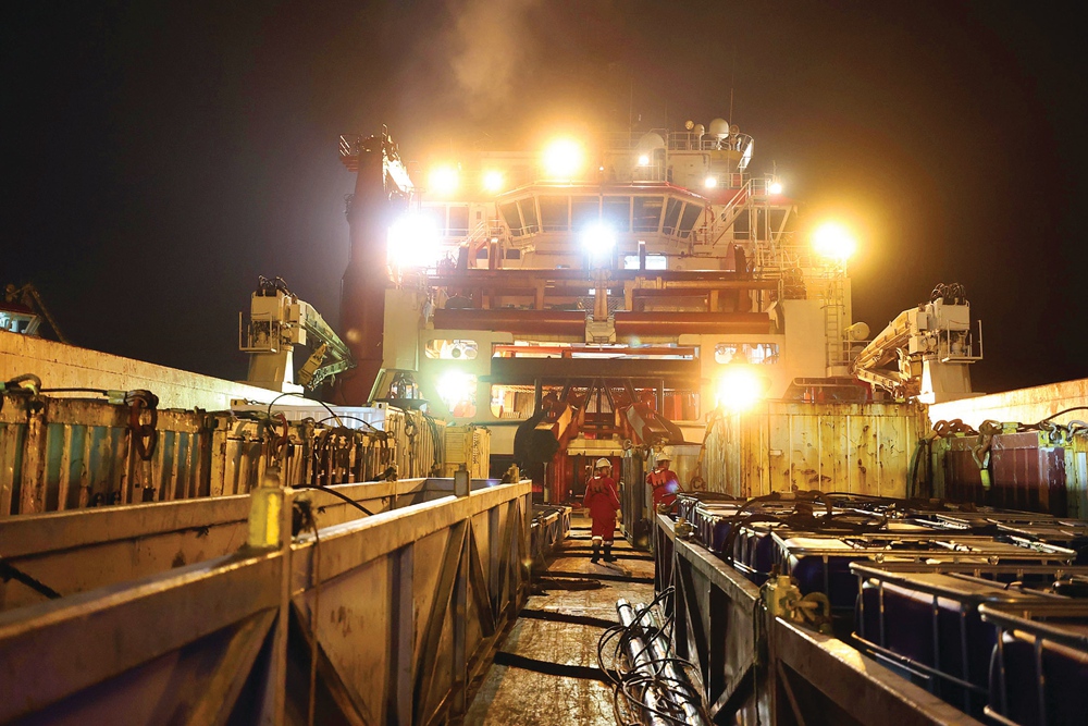 夜間,駛向大洋深處的“海洋石油681”船艙燈火通明,為確保船艙物資安全平穩(wěn),船員不定時(shí)在船艙巡查。