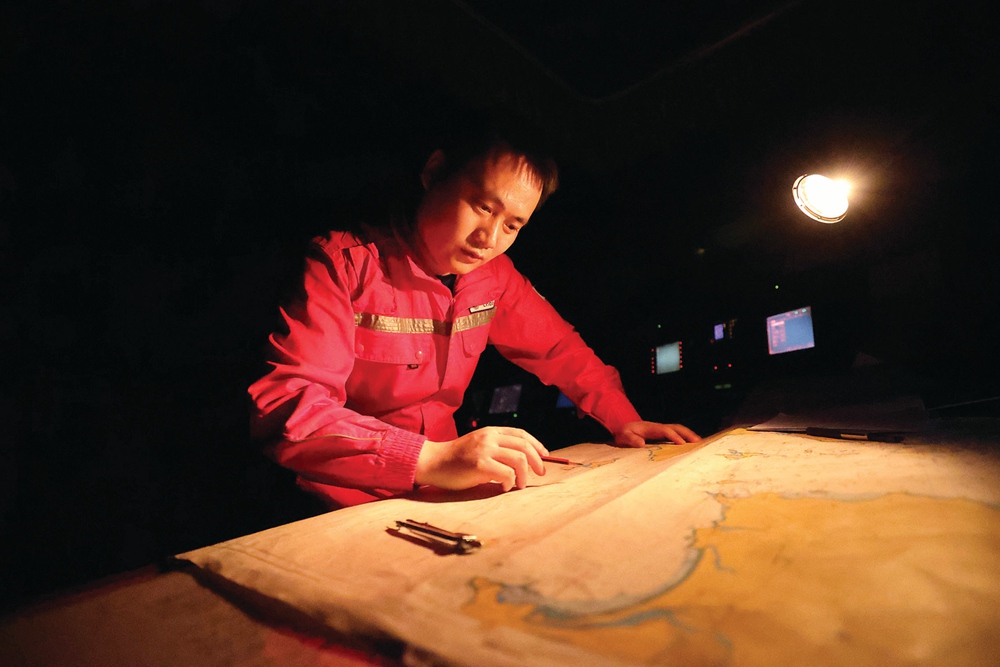 夜間行船過(guò)程中,“海洋石油681”船長(zhǎng)在海圖上標(biāo)定本次出海的航海路線標(biāo)識(shí)。