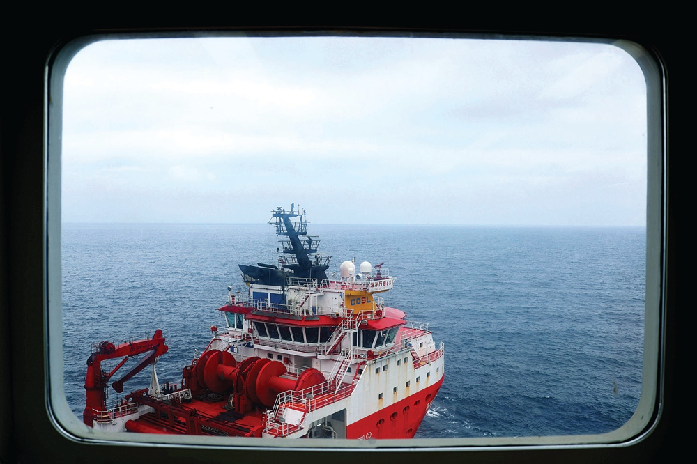 從惠州油田“國(guó)瑞”鉆井平臺(tái)船艙窗口望去,正在給平臺(tái)補(bǔ)給的“海洋石油681”猶如“護(hù)花使者”靜靜守護(hù)在平臺(tái)身邊。
