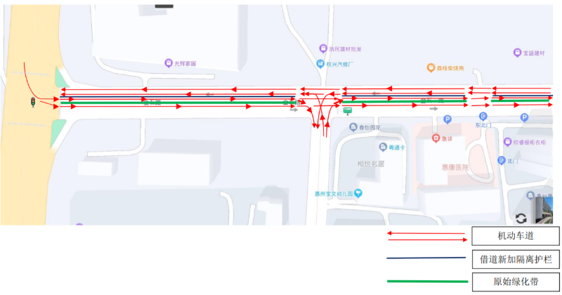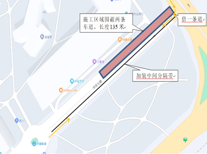 二、施工期間,水北七路圍蔽北側(cè)機(jī)動(dòng)車道,南側(cè)機(jī)動(dòng)車道調(diào)整為雙向二車道通行。