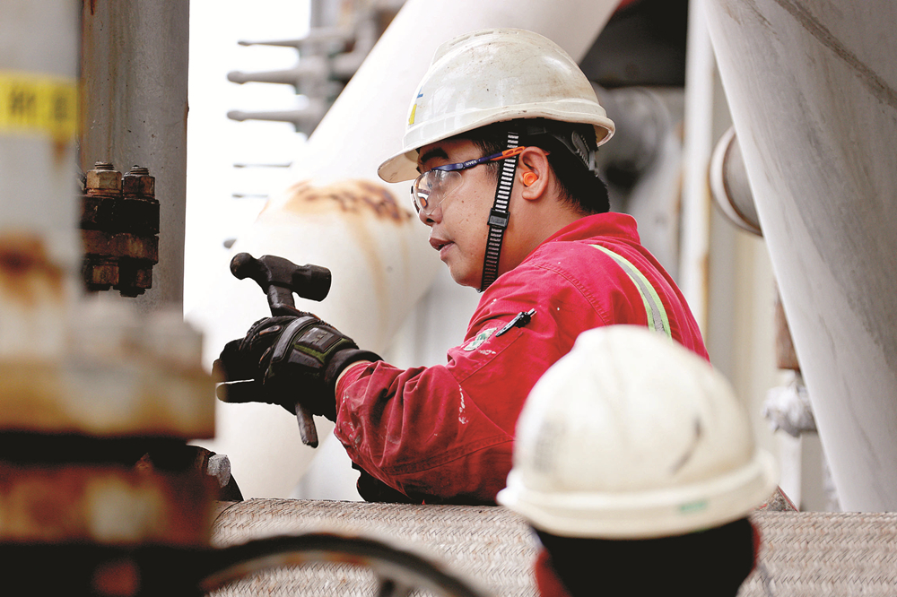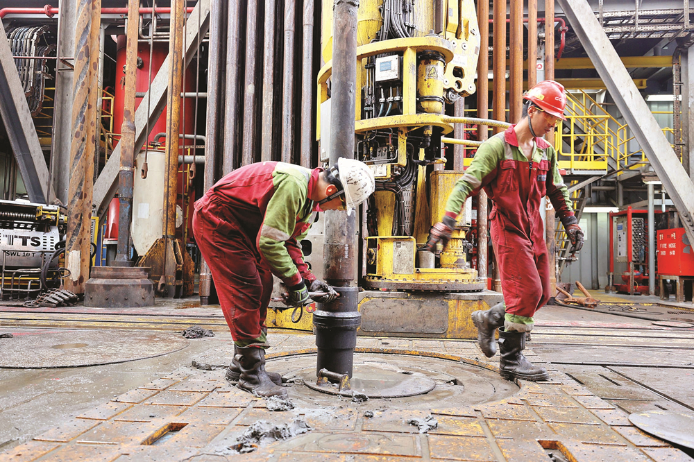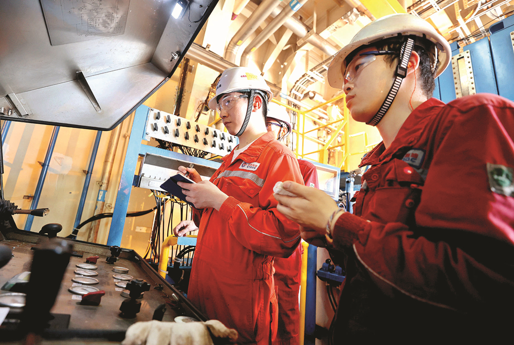 “國瑞”平臺鉆井區(qū)域,石油工人全神貫注記錄試驗數(shù)據(jù)。