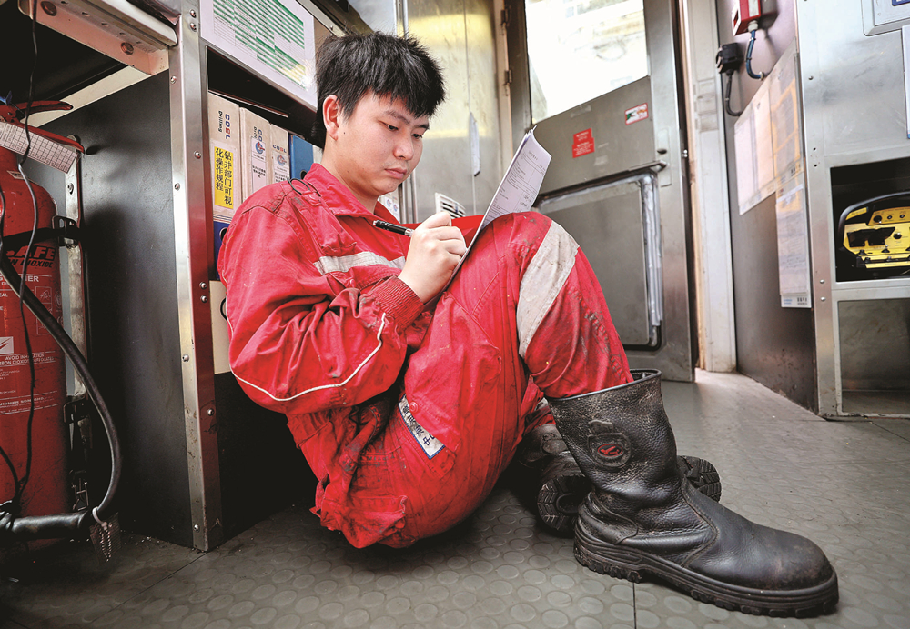 他們是機艙里的輪機員,每隔一兩個小時,就要頂著近40度高溫與超大噪聲巡檢一遍機艙設備,出來便是一身汗,如此反復接受“冰與火”的淬煉;