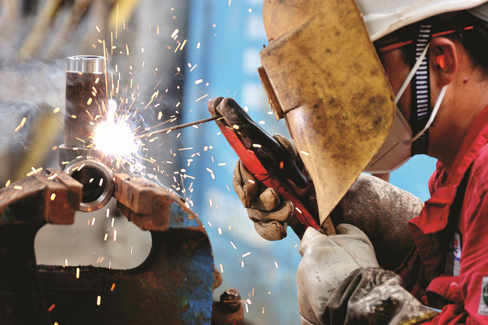 “國瑞”平臺配件制作區(qū)域,電焊工在焊接設備配件。