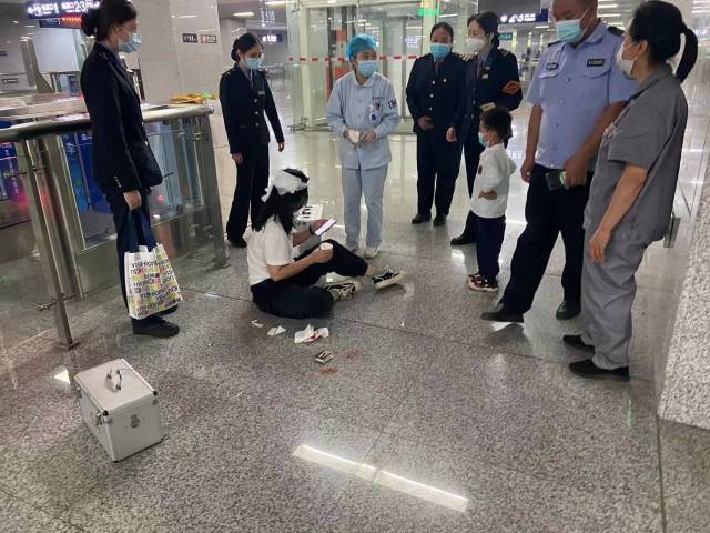 唐靜荷到達現(xiàn)場時,曾女士頭部已經(jīng)在流血,且出現(xiàn)意識模糊的狀態(tài),情況十分危急。一旁曾女士年幼的兒子不知所措地哭著。這時,唐靜荷迅速從急救箱中拿出紗布和止血帶,對她的傷口進行緊急止血處理,聞訊趕來的值班站長耐心地安撫著小男孩,客運員胡楊給曾女士母子送上巧克力和溫水。在車站工作人員的努力下,她的意識逐漸恢復,小男孩的情緒也穩(wěn)定下來。
