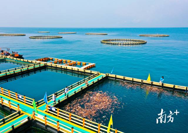 在惠東縣圣告島海域上,上百個大型深海養(yǎng)殖網(wǎng)箱整齊排列在海面上,網(wǎng)箱里養(yǎng)殖的是大黃魚、金鯧魚等大型海魚,這些魚在前期育種后被投入網(wǎng)箱,再經(jīng)過幾個月的海洋養(yǎng)殖后,出產(chǎn)海魚個頭肥大、肉質鮮美,深受港澳市場歡迎。