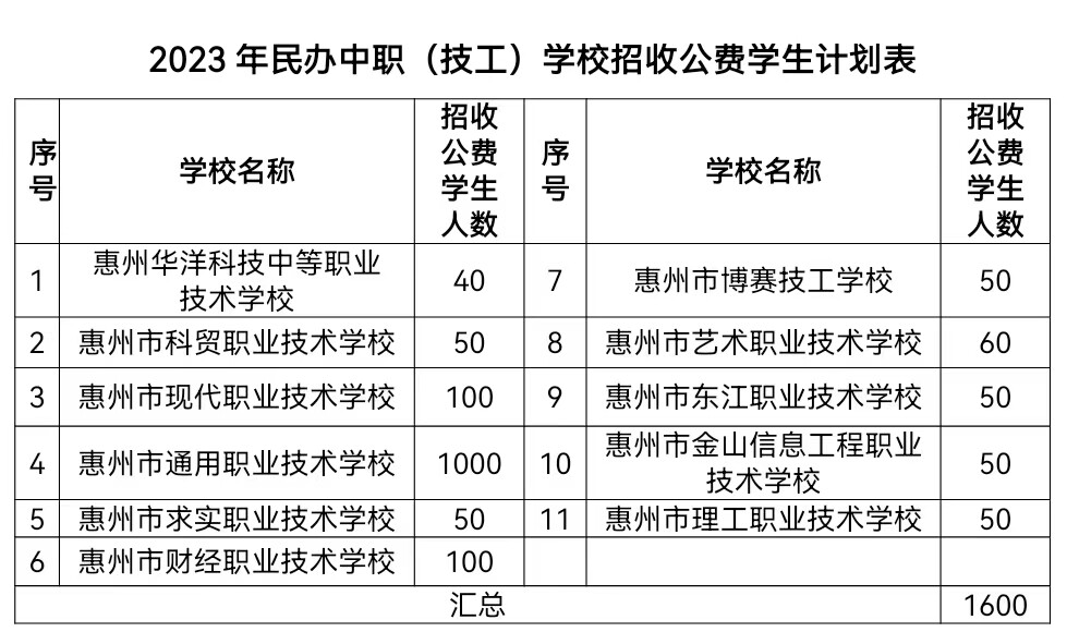 答:一是從2015年春季學(xué)期起,國(guó)家對(duì)就讀中職、技工院校的所有農(nóng)村(含縣鎮(zhèn))戶籍學(xué)生和城市涉農(nóng)專業(yè)學(xué)生及家庭經(jīng)濟(jì)困難學(xué)生免除3年學(xué)費(fèi)(藝術(shù)類相關(guān)表演專業(yè)除外,民辦學(xué)?梢匝a(bǔ)收差額學(xué)費(fèi))。二是從2015年春季學(xué)期起,國(guó)家對(duì)全日制正式學(xué)籍一、二年級(jí)涉農(nóng)專業(yè)學(xué)生和非涉農(nóng)專業(yè)家庭經(jīng)濟(jì)困難學(xué)生每人每年補(bǔ)助生活費(fèi)2000元。三是今年我市有11所民辦中職、技工院校參照《惠州市市屬公辦職業(yè)院校生均基準(zhǔn)定額標(biāo)準(zhǔn)》招收公費(fèi)生,具體招生條件詳詢招生院校。公費(fèi)生招生計(jì)劃見下表: