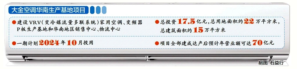 總投資17.5億元的大金空調(diào)華南生產(chǎn)基地項(xiàng)目在博羅縣動(dòng)工,項(xiàng)目全部達(dá)產(chǎn)后預(yù)計(jì)年?duì)I業(yè)額達(dá)70億元