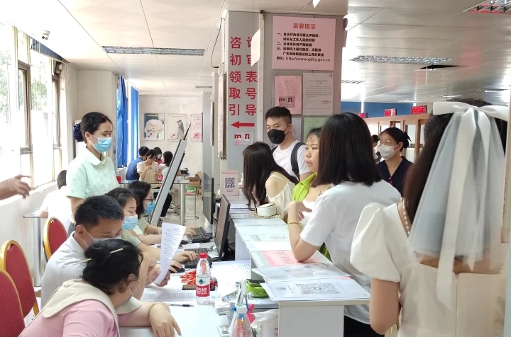 惠城區(qū)婚姻登記處排滿(mǎn)了前來(lái)登記結(jié)婚的新人。