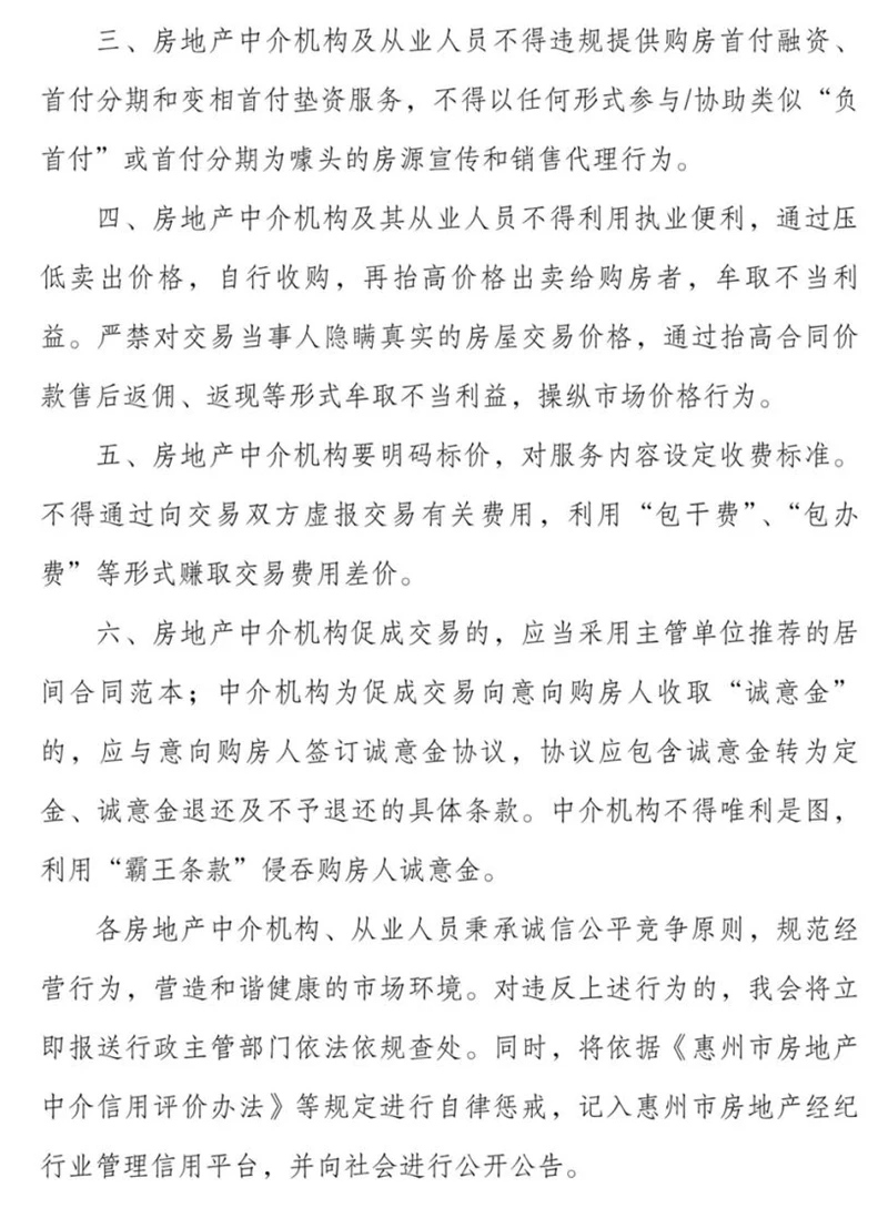 嚴(yán)禁中介機(jī)構(gòu)首付貸、返首付、零首付、虛假夸大宣傳……5月28日,惠州市房地產(chǎn)中介行業(yè)協(xié)會發(fā)布《關(guān)于規(guī)范房地產(chǎn)中介行業(yè)經(jīng)營行為的鄭重提示》(下稱“《鄭重提示》”),要求我市各房地產(chǎn)中介機(jī)構(gòu)要遵守行業(yè)準(zhǔn)則。一旦發(fā)現(xiàn)存在違法違規(guī)經(jīng)營行為,將報送行政主管部門依法依規(guī)查處并進(jìn)行信用懲戒。