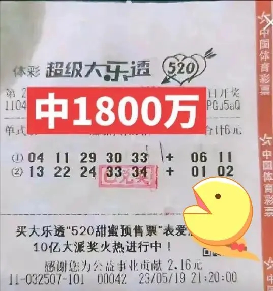 5月20日,體彩超級大樂透第23056期開獎,也是超級大樂透10億大派獎第18期開獎,位于惠州博羅縣戴屋小組小羅路282號的4411032507體彩實體店中出一張2注號碼、6元投入的單式追加票,獎金1800萬元,可惜由于單張彩票投注金額低于15元,白白錯失了瓜分每期1500萬元派獎獎金的機會。
