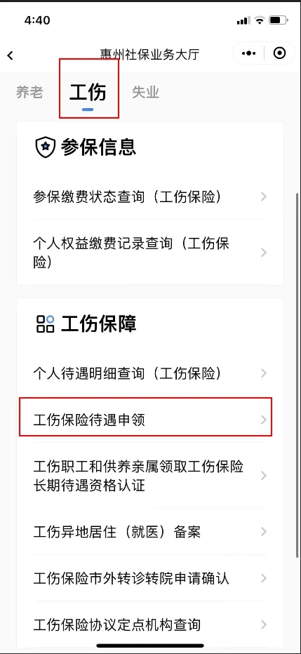 第二步:選擇“工傷”找到“工傷保險待遇申領(lǐng)”。