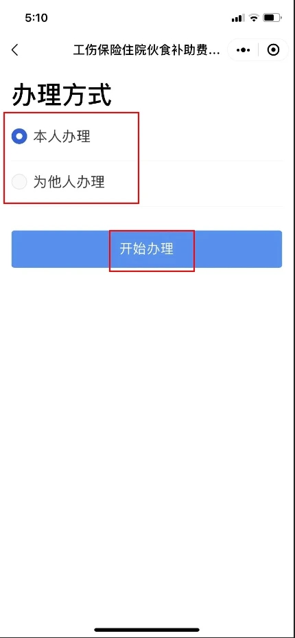 第三步:點擊“工傷保險住院伙食補(bǔ)助費申領(lǐng)”,根據(jù)提示授權(quán),授權(quán)完畢后開始辦理(除“本人辦理”還可“為他人辦理”)。