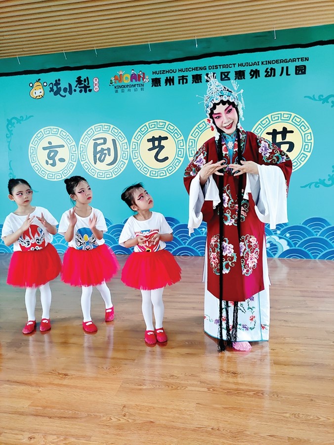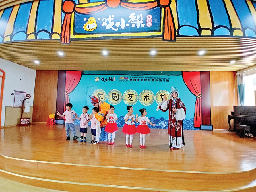 據(jù)國務(wù)院辦公廳印發(fā)《關(guān)于支持戲曲傳承發(fā)展的若干政策》以及中宣部等部門聯(lián)合下發(fā)《關(guān)于戲曲進校園的實施意見》等文件精神,近些年,各地對“京劇進校園”進行了深度實踐與探索。如從兩年前開始,惠城區(qū)惠外幼兒園依據(jù)幼兒的學(xué)齡特點,將京劇藝術(shù)整合滲透到幼兒學(xué)習(xí)生活,陶冶藝術(shù)情操,浸潤心靈,獲得更好的發(fā)展。