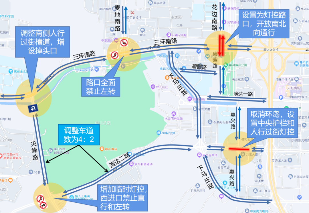 二、交通組織調(diào)整:施工期間,三環(huán)南路/麥地南路路口全面禁止左轉(zhuǎn);三環(huán)南路/花邊南路路口設(shè)置為燈控路口,開放南北向通行;演達(dá)二路/惠興路路口取消交通環(huán)島并設(shè)置東西向中央護(hù)欄和人行過街燈控;演達(dá)二路/尖峰路路口設(shè)置臨時燈控,西進(jìn)口禁止直行和左轉(zhuǎn);三環(huán)南路/尖峰路路口調(diào)整南側(cè)人行過街橫道位置,并增設(shè)掉頭口;尖峰路路段車道數(shù)調(diào)整為北往南4車道、南往北2車道;演達(dá)二路(尖峰路-下馬莊路段)路段車道數(shù)調(diào)整為西往東4車道、東往西2車道。