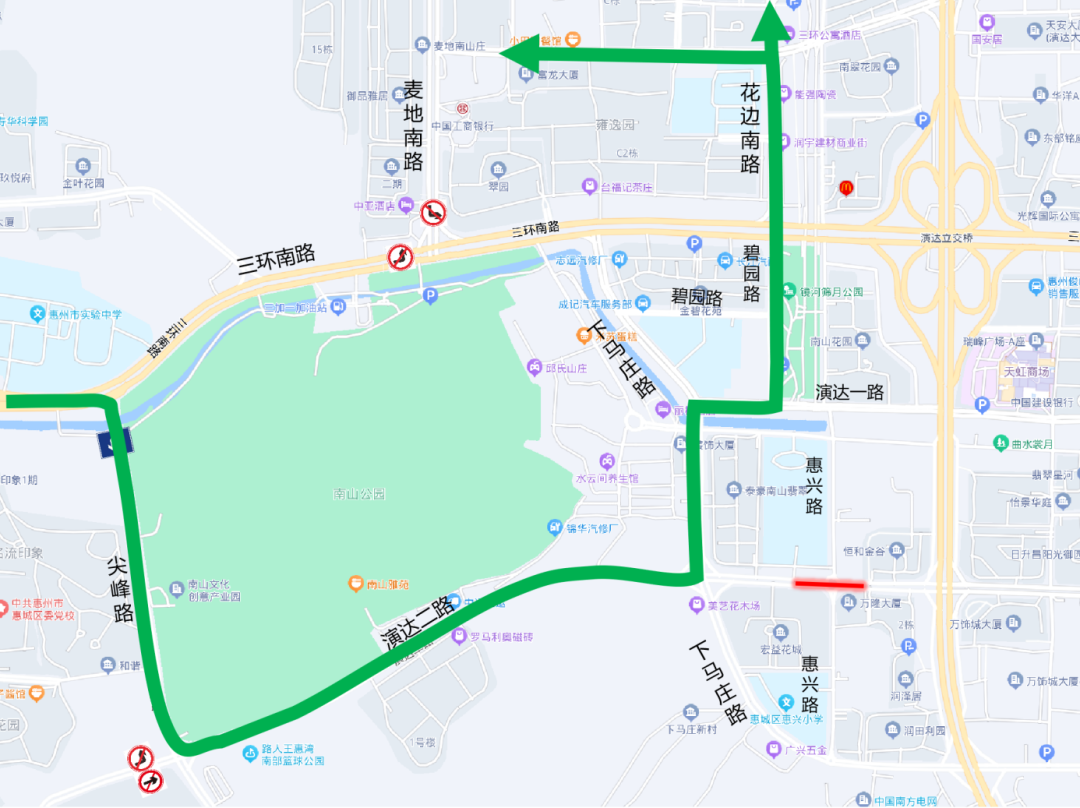 三、推薦繞行路線:仲愷往麥地南路方向車輛推薦繞行尖峰路-演達(dá)二路-下馬莊路-演達(dá)一路-碧園路-花邊南路等道路通行。
