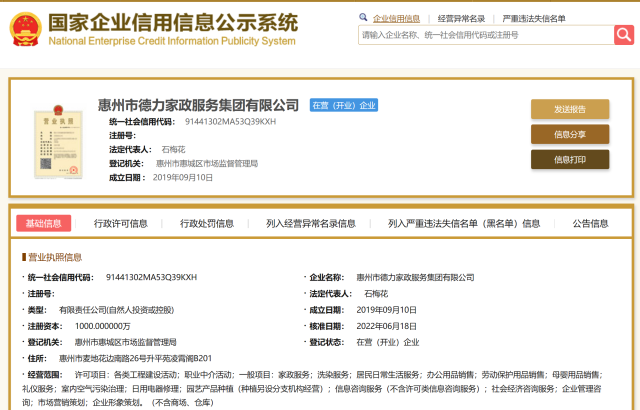 國家企業(yè)信用信息公示系統(tǒng)顯示,惠州市德力家政服務(wù)集團有限公司成立于2019年9月,經(jīng)營范圍包括家政服務(wù)、洗染服務(wù)等。