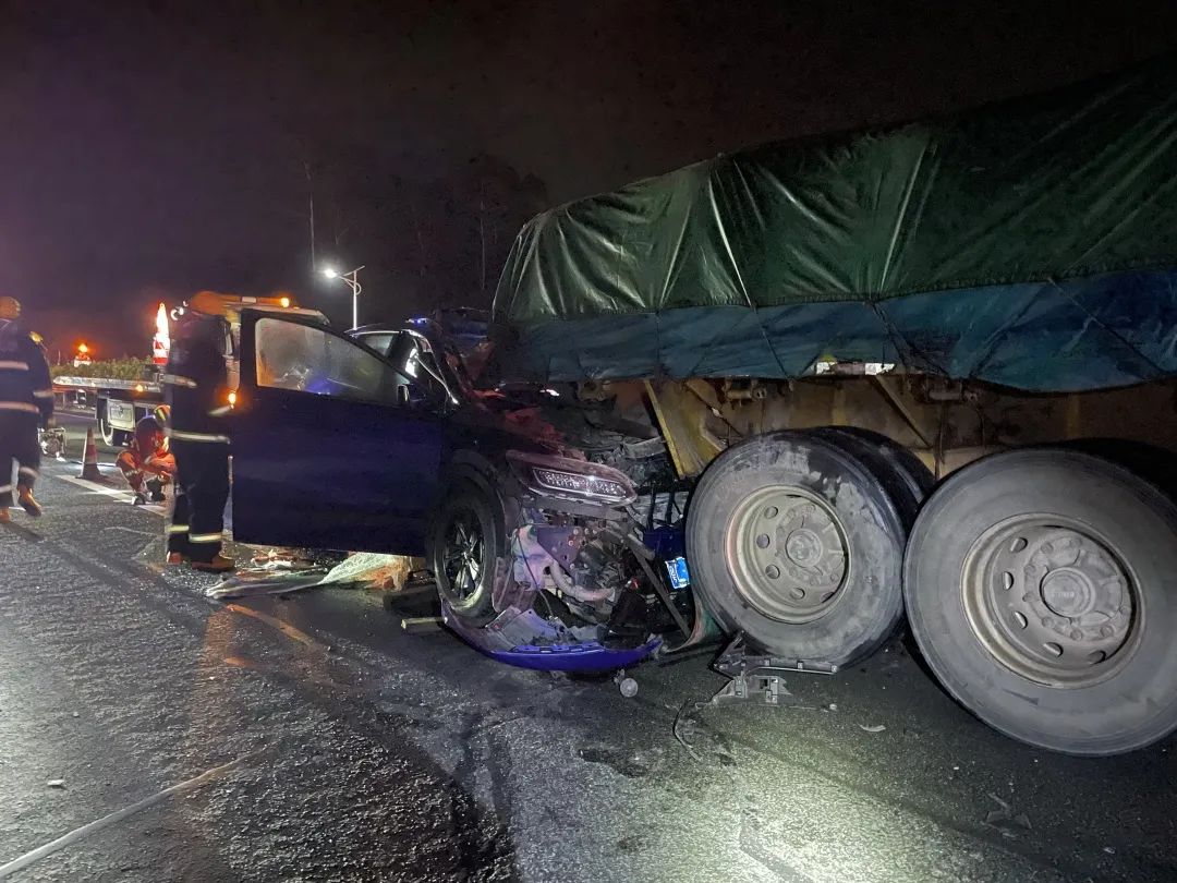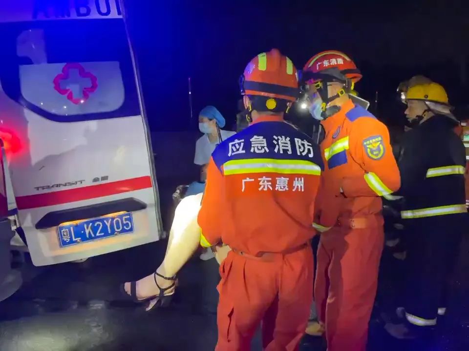 恐怖!惠州有一小車追尾大貨車,一名女子和小孩被困!