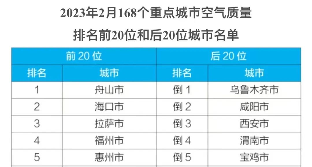2023年1~4月168個(gè)重點(diǎn)城市空氣質(zhì)量排名前20位和后20位城市名單。圖源廣東生態(tài)環(huán)境。