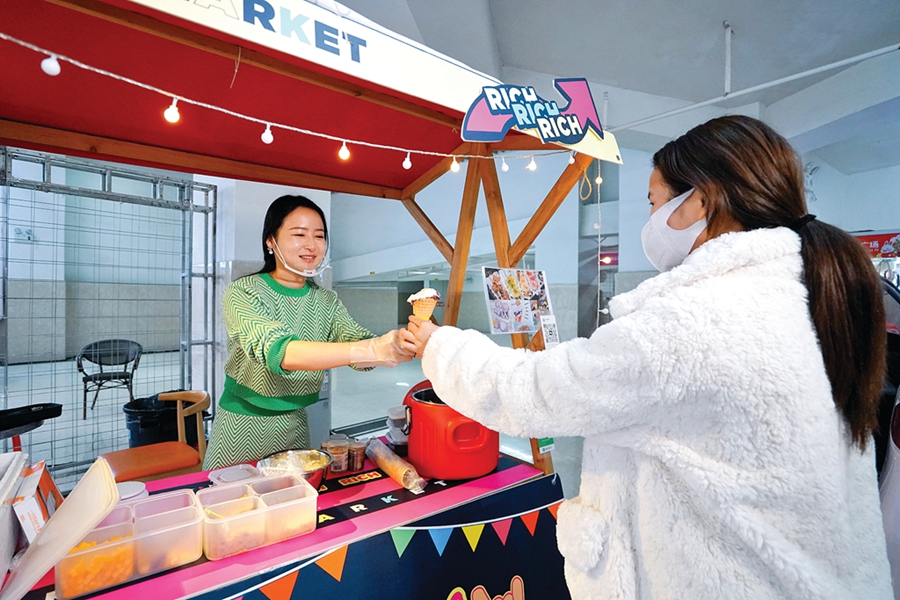 “直到現(xiàn)在,我還清晰記得第一次出車(chē)售賣(mài)熱奶寶的場(chǎng)景。食客們對(duì)我的支持,是我堅(jiān)定創(chuàng)業(yè)信心的重要力量!睆埇摤摽谥械摹俺鲕(chē)”,指的是一輛五菱宏光MINI新能源汽車(chē)。它外形精致而小巧,車(chē)身還裝飾著奧特曼卡通形象,十分奪人眼球。張瑩瑩說(shuō),創(chuàng)業(yè)以來(lái)甜點(diǎn)的上門(mén)配送、出車(chē)售賣(mài)等,均是依靠這輛車(chē)去完成!皠(chuàng)業(yè)初期我采取的是線上下單+線下配送的形式。”她坦言,受惡劣氣候影響,再加上制作、售賣(mài)等全過(guò)程工作都得靠自己完成,內(nèi)心一度覺(jué)得無(wú)法堅(jiān)持、難以為繼。但看到身邊的小吃創(chuàng)業(yè)者們?nèi)匀伙L(fēng)雨無(wú)阻地奮斗著,想著自己沒(méi)有理由就此輕言放棄。