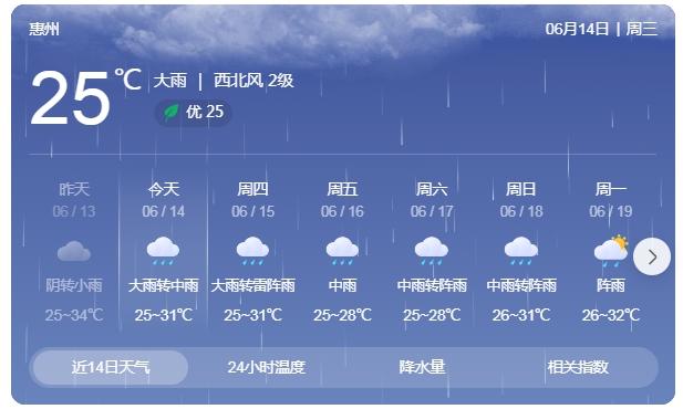 市氣象臺(tái)6月13日上午發(fā)布惠州重大氣象信息,預(yù)計(jì)本周我市進(jìn)入今年“龍舟水”降雨集中期,14~15日有大范圍大雨到暴雨,局部大暴雨,并伴有短時(shí)強(qiáng)降水、雷電和8級(jí)左右短時(shí)大風(fēng)等強(qiáng)對(duì)流天氣,全市平均雨量60~100毫米,局部150毫米以上;展望16~18日受西南季風(fēng)影響,仍有明顯降水。